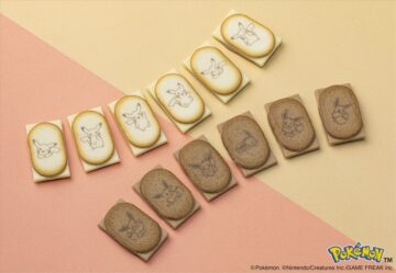 「はみ出しチョコのクッキーサンド」は、ピカチュウの絵柄が描かれたバナナヨーグルト味と、イーブイの絵柄がデザインされたキャラメルマキアート味の2種類がセット。シャリシャリッと軽やかに香ばしく焼きあげたラングドシャクッキーにショコラを思いっきりはみ出させた商品。