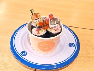 その他、コラボメニューとして、「細巻きに巻かれたにゃんこ」をイメージした「にゃんこカップ寿司」(400円)、“猫型ナゲット”が入った「ポテにゃげコンボ」(530円)、「くろにゃん」をイメージした「くろにゃんチョコケーキ」(480円)、「にゃんごろスシサンド」(250円)、「にゃんにゃんチョコミルク」(480円)の全5種が楽しめます。
