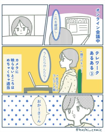 ハシコさん「カメラはオフでもよい会議だったのですが、オンになっていることに気付かず、すっぴんでパジャマ姿のまましばらく映っていたことがあります(笑)。テレワークは油断するとすぐに『素』が出てしまいますね」