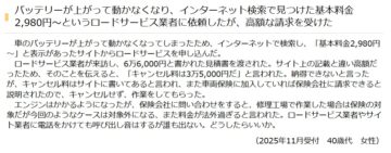 国民生活センターによると、車のバッテリーが上がって動かなくなり、ネット検索で見つけた「基本料金2,980円~」というロードサービス業者に依頼したところ、6万6000円と書かれた見積書を渡された事例があったということです。