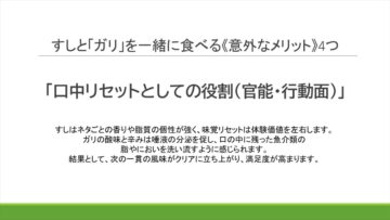 すしはネタごとの香りや脂質の個性が強く、味覚リセットは体験価値を左右します。ガリの酸味と辛みは唾液の分泌を促し、口の中に残った魚介類の脂やにおいを洗い流すように感じられます。結果として、次の一貫の風味がクリアに立ち上がり、満足度が高まります。