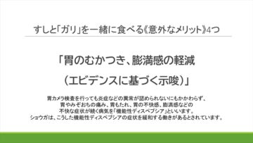 また、ショウガに含まれているジンゲロールとショウガオールは、消化管運動の促進や悪心の軽減に関与するという報告があります。ガリは少量でも口直しとして体感的にすっきりします。