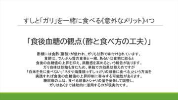 酢飯には食酢(酢酸)が使われ、ガリも甘酢で味付けされています。食酢は、でんぷん質の食事と一緒、あるいは食前に取ると、食後の血糖値の上昇を抑え、満腹感を高めるという報告があります。ガリ自体は砂糖も含むため、単独での効果は控えめですが、「白米を先に食べない」「ネタや海藻類→すし→ガリの順番に食べる」という方法を実践すれば、食後の血糖値の上昇抑制に寄与する可能性があります。糖尿病の人は、食べる順番とシャリの量を優先して調整し、ガリはあくまで補助的に活用するのが現実的です。