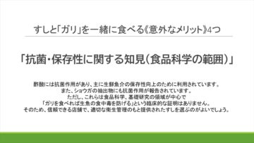 酢酸には抗菌作用があり、主に生鮮魚介の保存性向上のために利用されています。また、ショウガの抽出物にも抗菌作用が報告されています。ただし、これらは食品科学、基礎研究の領域が中心で、「ガリを食べれば生魚の食中毒を防げる」という臨床的な証明はありません。そのため、信頼できる店舗で、適切な衛生管理のもと提供されたすしを選ぶのがよいでしょう。