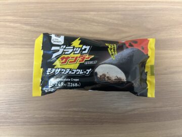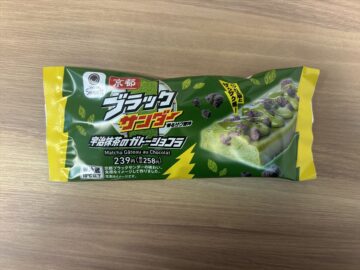 「京都ブラックサンダー 宇治抹茶のガトーショコラ」は、抹茶が苦手な人も楽しめる、ほどよい甘さの抹茶チョコソースが特長。トッピングされたココアクランブルが“ザクザク感”を生み出し、「京都ブラックサンダー」をアップグレードさせたような仕上がり。生チョコのこってりとした味わいが強く、1個食べるだけでかなり満足感がありました。価格は258円です。