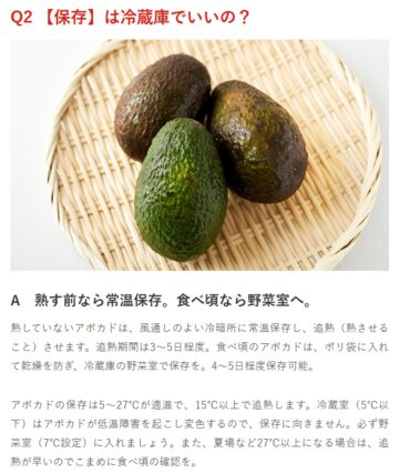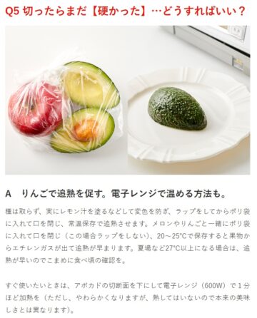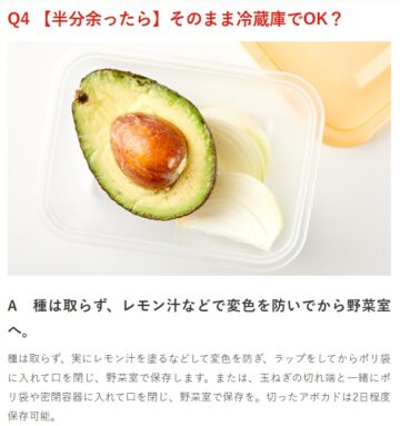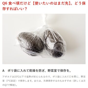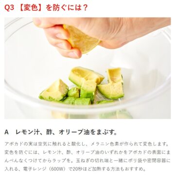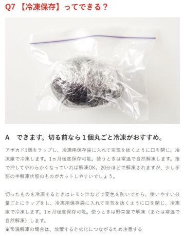 冷凍保存する方法について、「アボカド1個をラップし、冷凍用保存袋に入れて空気を抜くように口を閉じ、冷凍庫で冷凍します」と解説しています。