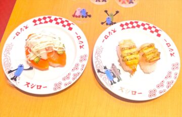 コラボは後半も実施。同月18日に始まる後半では、ピック(全5種)が1枚付く「こだわりハンバーグにぎり」と「まぐたく巻」(ともに250円~)、クリアポーチ&シール(全3種)のセットが1個付いた「ぷちローセット」(680円~)も登場します。