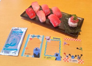 コラボメニューでは、クリアピック(全5種)が1枚付いた「えびと蒸し帆立のバジルマヨチーズ炙(あぶ)り」「サーモンアボカド」(ともに250円~)、ステッカー(全5種)が1枚付属した「ふわふわ苺クリームのガトーショコラ」(350円~)、クリアカード(全3種)が1枚セットになった「天然インド鮪(マグロ)7貫盛り」(1220円~)が発売。クリアカードには、コラボ限定「湯呑み2個セット」が当たる二次元コードが付いています。