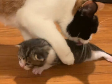 初めての大冒険に出たポコちびの体を優しくなめるぺこ美は、まるで「おとなしく中にいないとダメなのニャ」と声を掛けているようです。初めてのことで戸惑うぺこ美をよそに、得意げに動き回るポコちび。