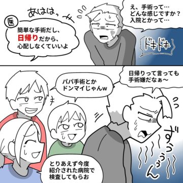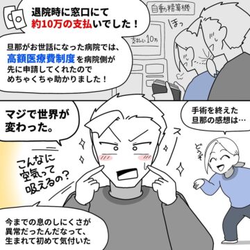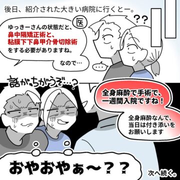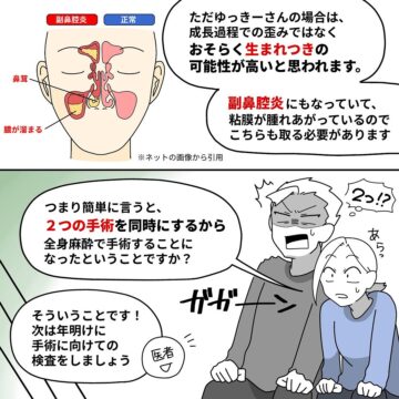 「鼻が詰まって息ができない」という夫を、妻が耳鼻科に連れていきました。診察の結果、片側の鼻にほぼ空気が通っていないことが判明。簡単な手術で治ると言われましたが……という内容で、読者からは「私も同じ治療を受けました」「共感しかない!」などの声が上がっています。