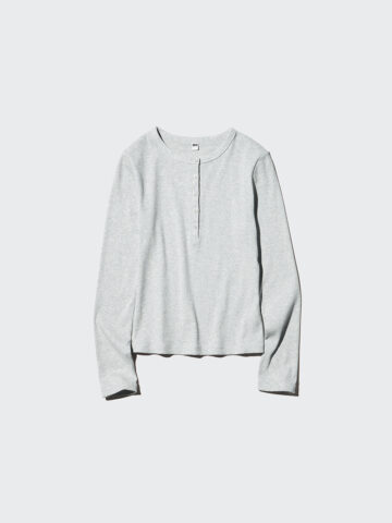 3つ目は、「ライトブルー×ライトグレー」。2枚重ねてもかわいく決まる万能アイテム、「リブヘンリーネックT/長袖」の、「60 LIGHT BLUE」と「02 LIGHT GRAY」をレイヤード。重ね着するときは、上に着るほうのボタンを1つ多めに外すのが、バランスよく見えるポイントです。
