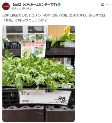 「コメントの中にあって知ったのですが、西日本では『菊菜』と呼ぶのでしょうか?」と、公式アカウントも初めて知った様子です。「福岡だけど春菊と呼んでます」「広島だけど春菊」「大阪の知り合いが『菊菜』と言っていてほー!と思いました」といった投稿があり、地域によって違いがあるようです。