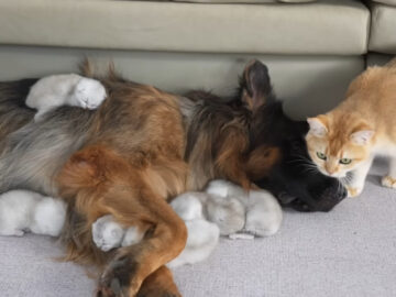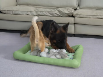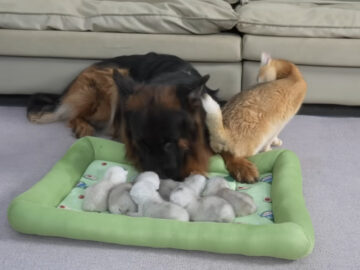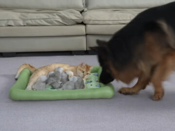 「ひとりでお世話しているの? 僕も手伝うよ」と言わんばかりに子猫たちを見守るジャーマン・シェパード。母猫はシェパードにぴったりと体をすり寄せます。2匹には、家族のような信頼関係があるのが伝わってきますね。