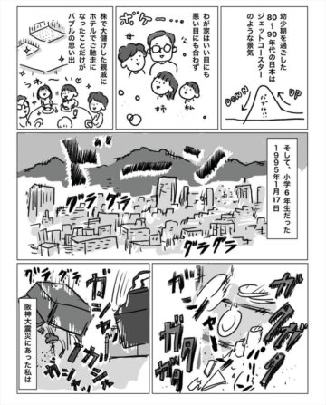 うつみさん「阪神淡路大震災は、私にとって初めての『日常生活が突然失われる体験』。でもあの頃の私は、たくさんのものを失った人たちに思いを寄せることはできませんでした。30年以上たった今、心から感じたことを素直に娘に伝えたところ、意外な言葉が返ってきたので書き留めたいと思いました」