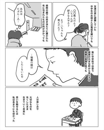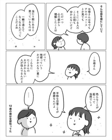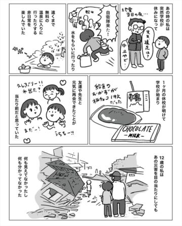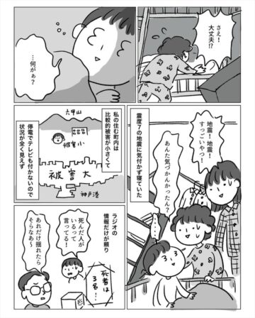 12歳のとき、阪神淡路大震災で被害に遭った作者。しかし当時は幼く、周囲の苦しみや悲しみに気付くことができませんでした。その話を娘にしたところ…という内容で、読者からは「不幸中の幸いでしたね」「娘さんに学ばされました」などの声が上がっています。