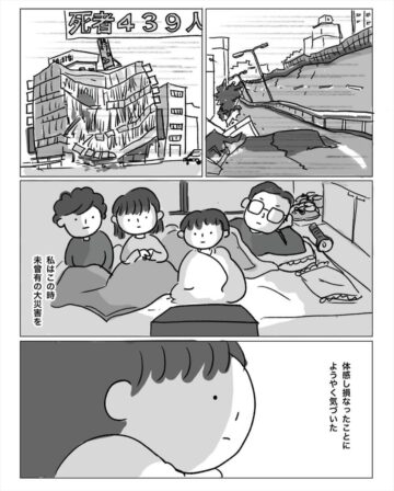 うつみさえさんの、阪神淡路大震災で被災した経験を娘に話したときのエピソードを描いた漫画が、インスタグラムで600以上の「いいね」を集めて話題となっています。