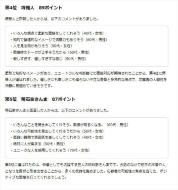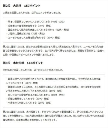 2位は、俳優の大泉洋さんで、157ポイントでした。回答では、「明るい雰囲気でリラックスさせてくれそう」(40代・女性)、「応募者の本音を聞き出せそう」(70代・男性)、「ユーモアもあり人を見る目がありそう」(50代・男性)といった意見が見られたとのことです。