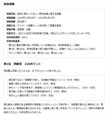 アンケートは、公正かつ誠実に人材を見極められる「面接官」として「会社の採用活動に関わってほしい」と思われている男性俳優は誰なのかを調査。2025年12月26日~2026年1月13日にかけて、企業の経営者や役員564人を対象にアンケート調査ツールを利用して実施されました。回答は1~3位まで自由回答で記載。1位は3ポイント、2位は2ポイント、3位は1ポイントで計算。