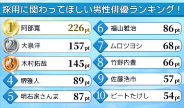 1位は、俳優の阿部寛さんでした。226ポイント。投票者からは「威圧感ではなく“信頼感”が強く、判断軸が明確なイメージ」(40代・男性)、「実直に相手と向き合ってくれそう」(50代・男性)、「落ち着いた語りで応募者の本質を見抜きそう」(40代・男性)などのコメントが集まったということです。