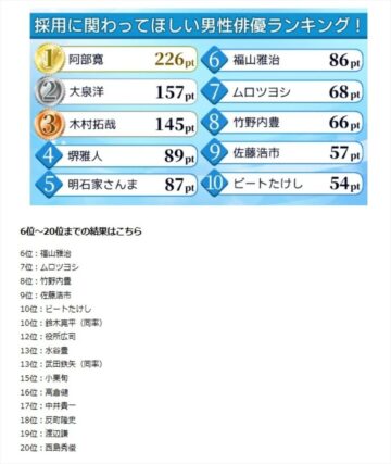 ワンズマインド(東京都新宿区)が運営するビジネスマッチングサイト「比較ビズ」が、「採用に関わってほしい男性俳優」に関するアンケート調査を行い、結果をランキングで紹介しています。