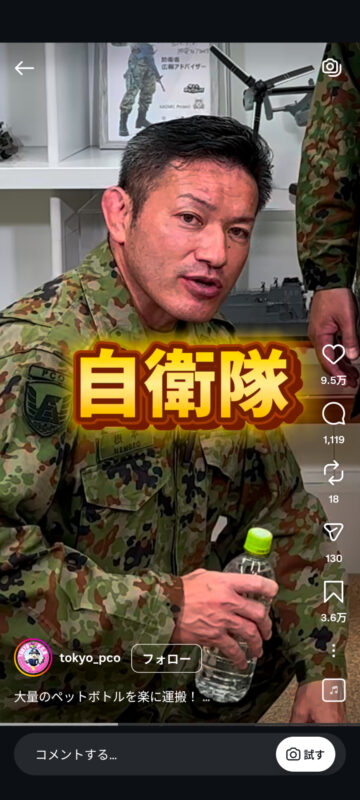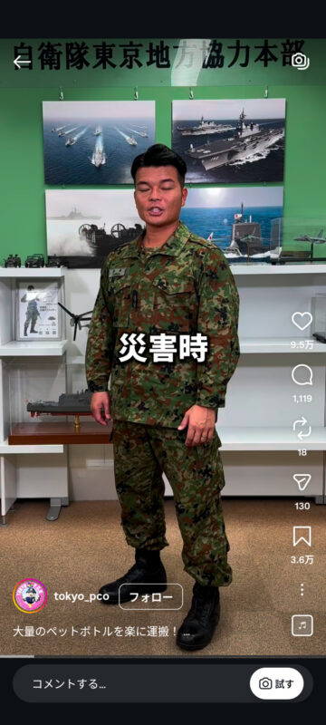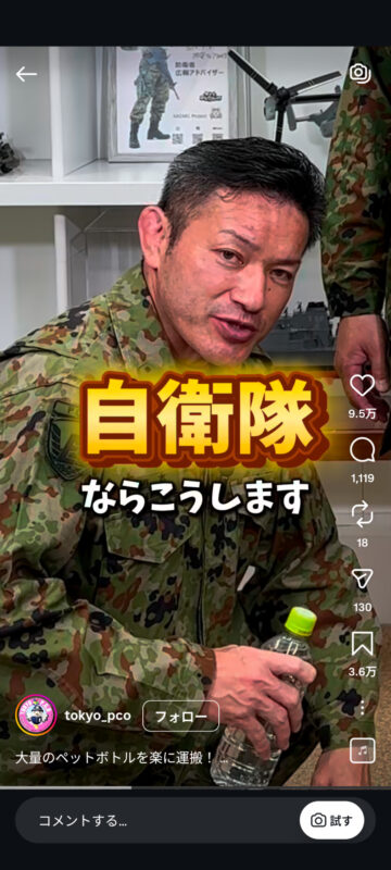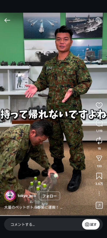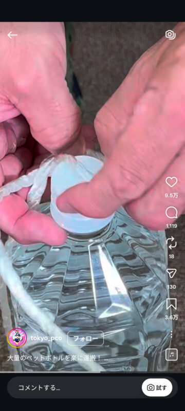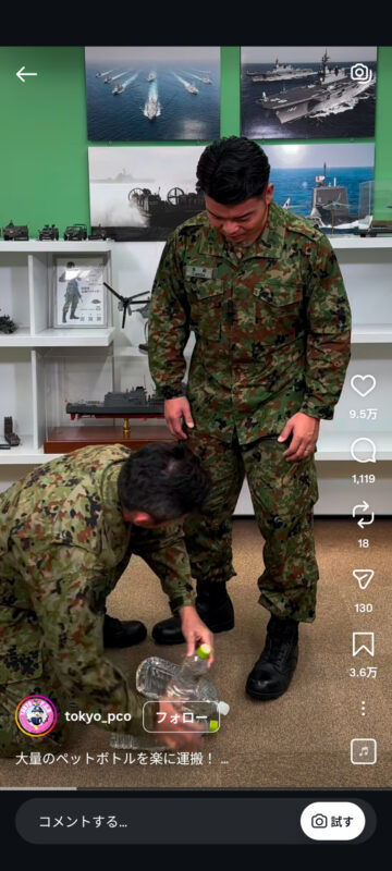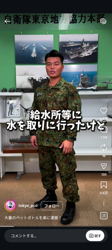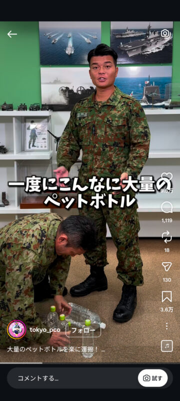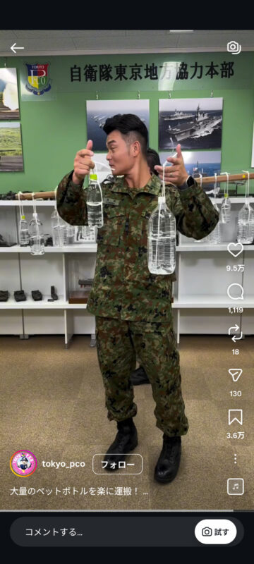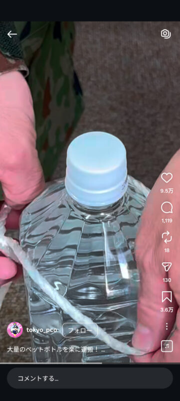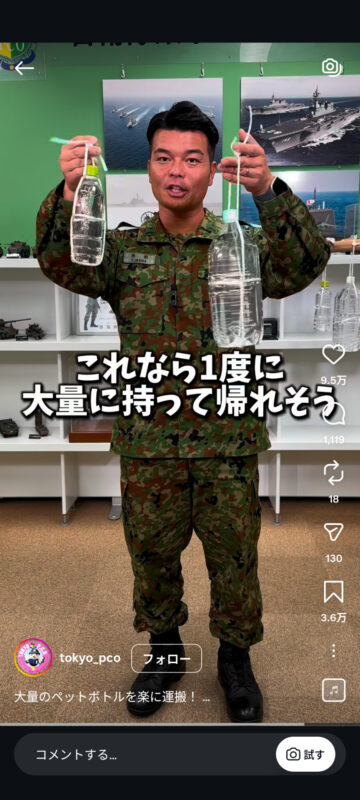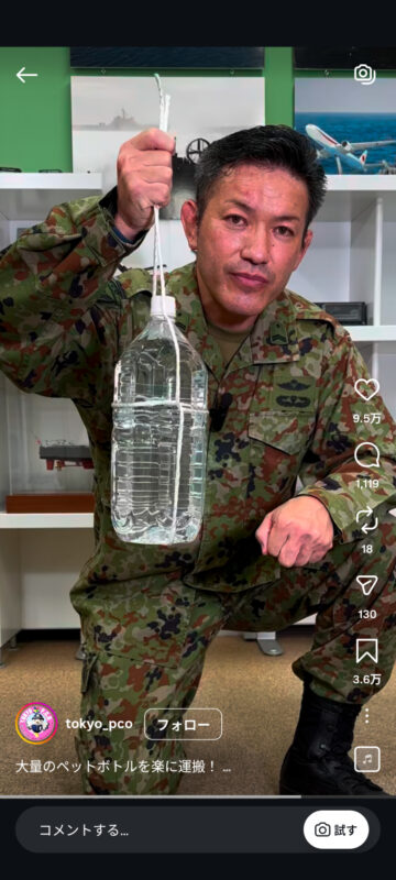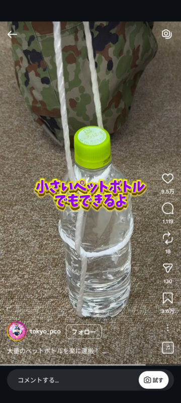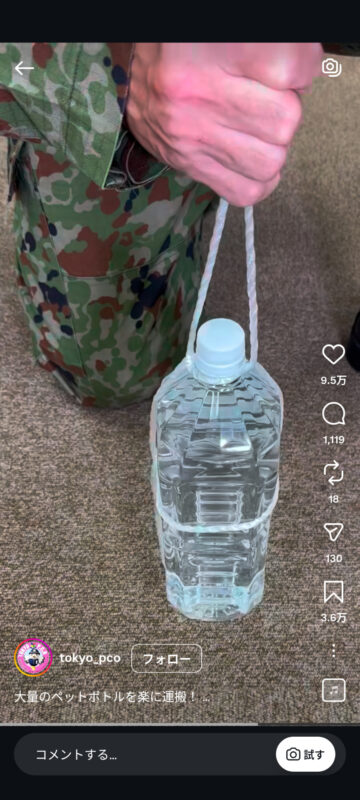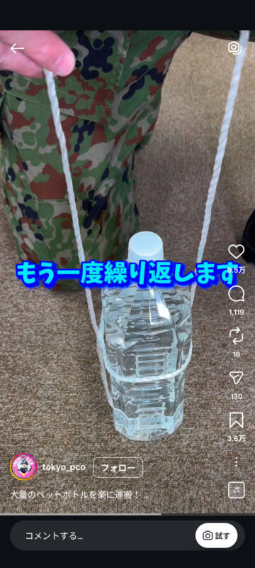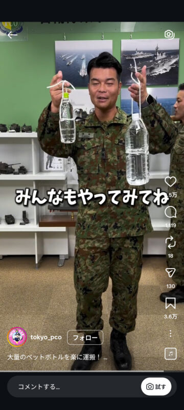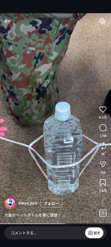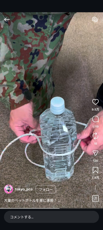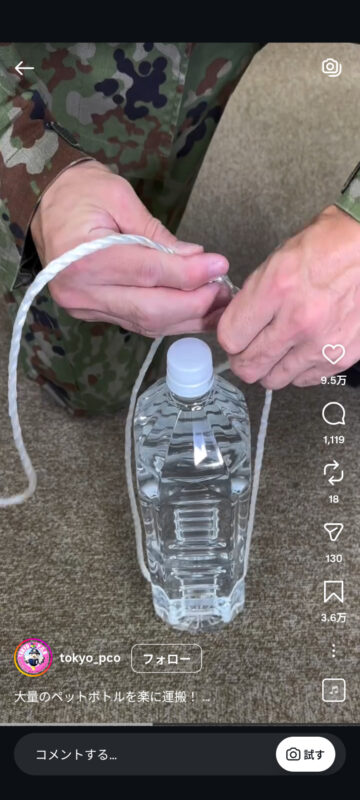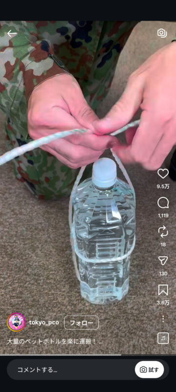 災害時に大量のペットボトルを楽に持ち運ぶ方法について、自衛隊東京地方協力本部がインスタグラムの公式アカウントで紹介しています。