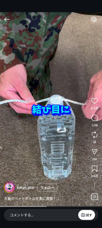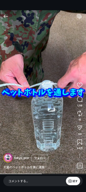 自衛隊は「大量のペットボトルを楽に運搬! バッグなどがない場合に備えて覚えておいてね」と投稿し、動画を投稿。この動画では、自衛官が、ひもを使ってペットボトルを運搬する方法について、次のように紹介しています。
