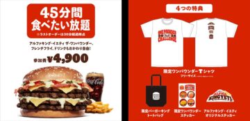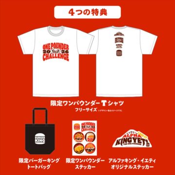 なお、参加特典として「限定ワンパウンダーTシャツ」と「限定バーガーキング トートバッグ」「限定ワンパウンダーステッカー」「オリジナルステッカー」を各1個ずつもらえます。