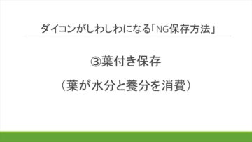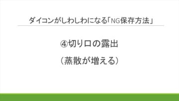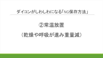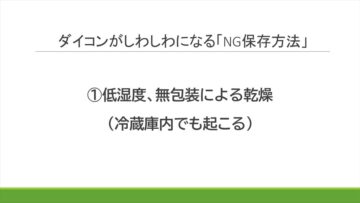 Q.では、どのような保存の仕方をしてしまうと、ダイコンがしわしわになってしまうのでしょうか。自宅で保存する際のNGの保存法について、教えてください。
