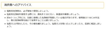 ・排水トラップ内には、以前使用した洗浄剤が残留している場合がある。使用後は十分に水を流し、他の洗浄剤などを続けて使用することを避ける。