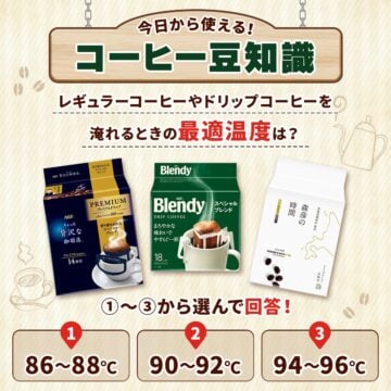 正解について、「レギュラーコーヒーやドリップコーヒーを入れるときの最適温度は…(2)90~92℃ でした!」と明かしています。これよりも湯温が高くなると、苦みが強くなり、逆に温度が下がると酸味が強くなる場合があるといいます。