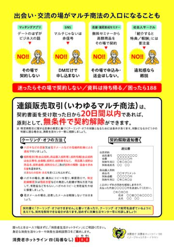 連鎖販売取引(いわゆるマルチ商法)は、契約書面を受け取った日から20日以内であれば、原則としてクーリング・オフできるということです。
