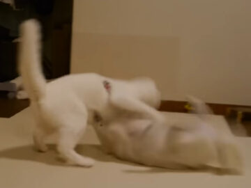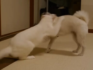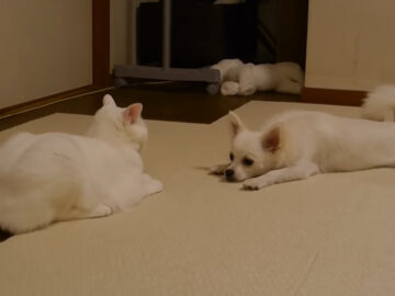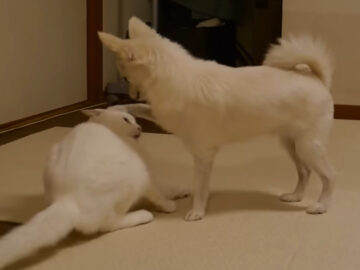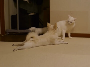うっとうしそうな猫の表情も気にせず近づきますが、とうとう猫の逆鱗(げきりん)に触れて取っ組み合いの体勢に。猫はそのまま犬を床に投げ飛ばし、人間も顔負けの見事な一本が決まりました。