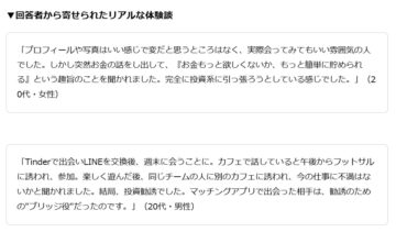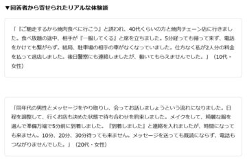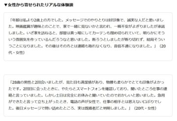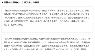 男性からは「高級なレストランを予約していざ待ち合わせをすると、全く写真とは別人の女性が現れました」、「アプリでは自分より2歳年上の女性。写真から見ても細身で年齢も申告と大差なし。しかし、実際に会ってみるとどう見ても10歳程度年上。ジェネレーションギャップを感じました」といった体験談が寄せられています。