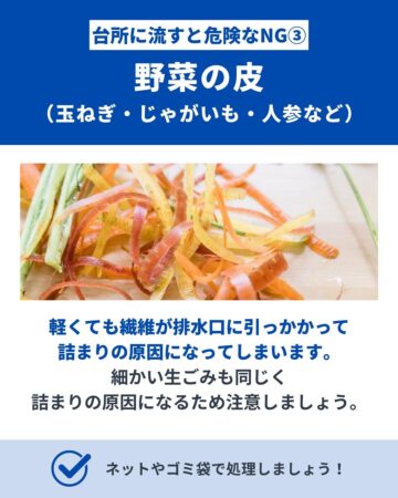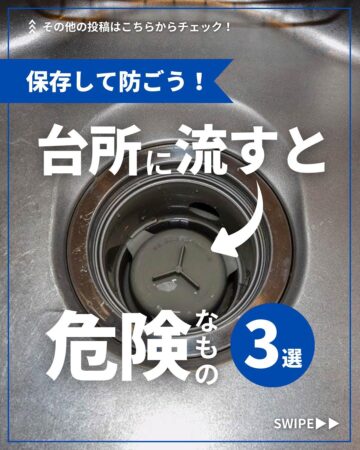 水回りの緊急メンテナンスやリフォームを手がける「クラシアン」の公式インスタグラムアカウントが、台所の排水口に流すと危険な3つのものを紹介しています。