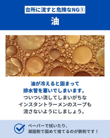 油が冷えると固まって、排水管をふさいでしまう。インスタントラーメンのスープも流さないようにする。ペーパーで拭いたり、凝固剤で固めて捨てたりすることが鉄則。