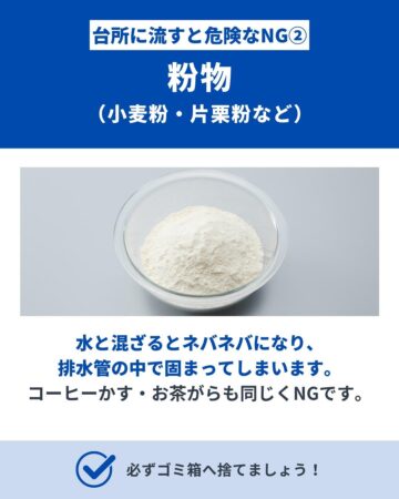 水と混ざるとネバネバになり、排水管の中で固まってしまう。コーヒーかす・お茶がらもNG。必ずゴミ箱に捨てる。