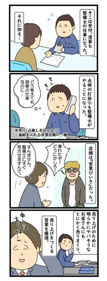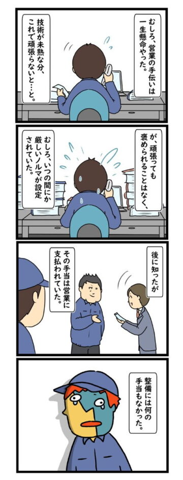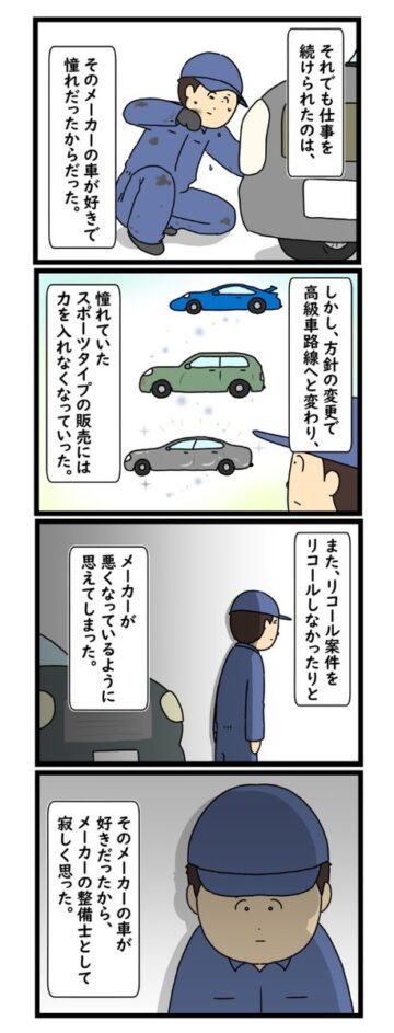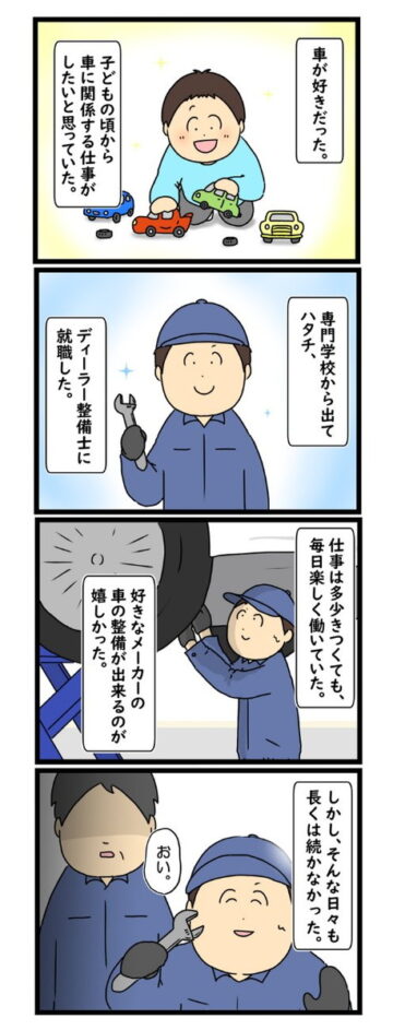 子どもの頃から車が好きで、ディーラー整備士の道に進んだ男性。仕事は多少きつくてもやりがいがあり、毎日楽しく働いていました。しかし、工場長が変わると職場の雰囲気が一変し…という内容で、読者からは「高い専門性で責任が重い仕事なのに、安すぎる」「自分もそういう環境でした」「ブラック企業からは逃げましょう」などの声が上がっています。