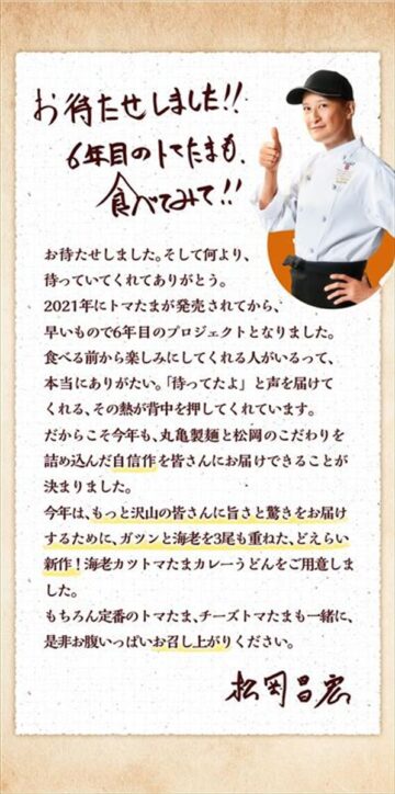 松岡さんは、海老カツトマたまカレーうどんについて「今年も、丸亀製麺と松岡のこだわりを詰め込んだ自信作を皆さんにお届けできることが決まりました。今年はもっとたくさんの皆さんにうまさと驚きをお届けするために、ガツンと海老を3尾も重ねた、どえらい新作! 海老カツトマたまカレーうどんを用意しました」とコメント。さらに「ぜひ、おなかいっぱいお召し上がりください」と呼び掛けています。