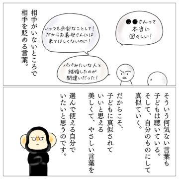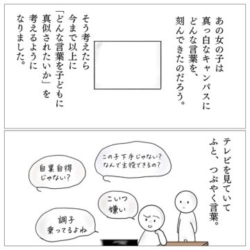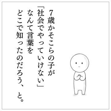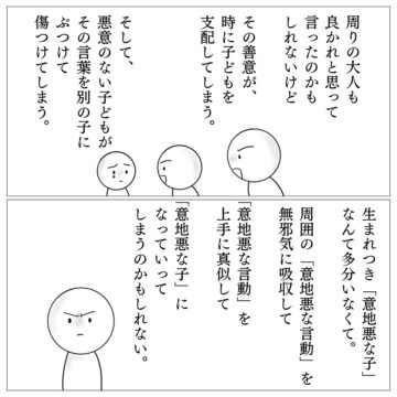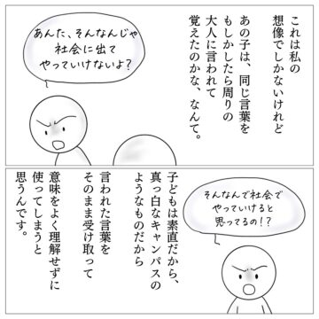 子育てをしていて、子どもは親や周囲の『言葉』をよく聞いているなと感じることが多々あります。このときは、『小学生なのに“社会に出てからやっていけない”なんて、とても大人びた言葉を知っているな』と驚きました。でもよく考えたら、自分の言葉の辞書にないと使えないですし、『あの子も誰かにそう言われたのだろうか』『であれば、子どもたちのドキッとする言動は、周囲の大人のまねなのではないか』と思い、自分の襟を正すつもりで描きました」