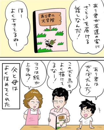 makoshさん「『すてきなお父さまですね』『涙があふれちゃいました』『絵本の中身、読んでみたい』などうれしいコメントをたくさんいただきました。実は、作中にも登場した『あり君の大冒険』の中身や、僕の子どもが作った本についてもインスタグラムで投稿しています。気になる方はぜひそちらもご覧ください」