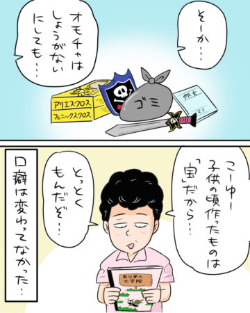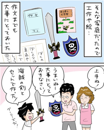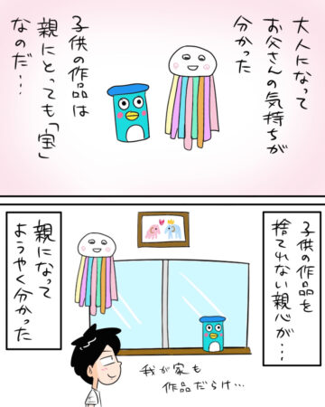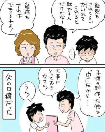 小学生の頃、絵や工作が得意だった作者。父からは、「子どもの頃に作った物は宝」「大事にとっておきなさい」と言われていました。しかし中学生になり、思春期に入った作者は、いつまでも作品をとっておくことが恥ずかしくなって…という内容で、読者からは「感動して涙が…」「両親の存在は偉大ですよね」「親から子へ、大切な思いは受け継がれる」などの声が上がっています。