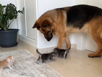「遊んでニャ~」 超巨大なジャーマンシェパードに迫る子猫たち
