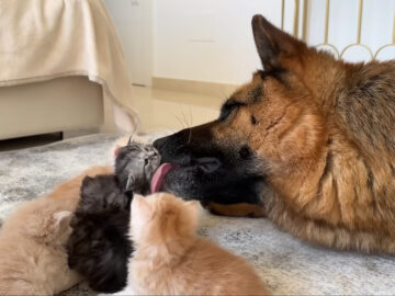 子猫をぺろぺろとなめてあげるロッキー。やっと遊んでもらえて幸せそうな子猫たちと、優しいシェパードの様子がほほ笑ましいですね。