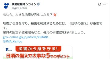 大地震に必要な備えについて、政府広報オンラインの公式Xアカウントが紹介しています。