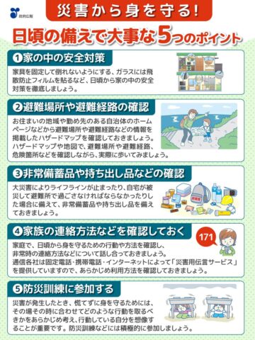 公式アカウントは「もし今、大きな地震が発生したら?」と投稿。「地震から身を守り、被害を軽減するためには、『日頃の備え』が重要です」「家具の固定や避難場所など、備えの再確認を行いましょう」と伝え、次の5つの対策を紹介しています。