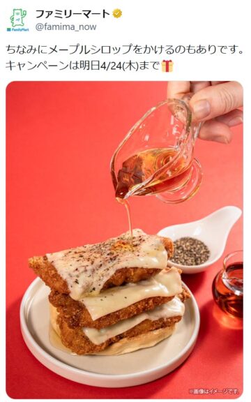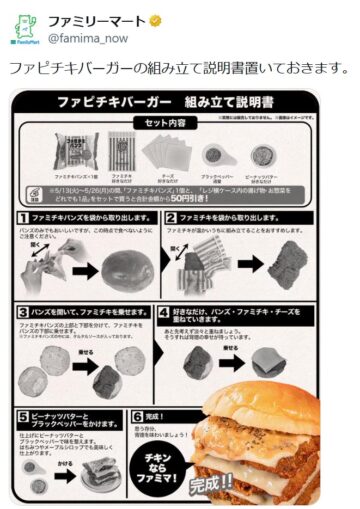 公式アカウントは、2025年4月に「この食べ方はやらせたい」とコメントし、ふんわりした食感のパンにタルタルソースをサンドした「ファミチキバンズ」に、「ファミチキ」とチーズ、ブラックペッパー、ピーナツバターを挟んだ「ファピチキバーガー」を紹介しました。