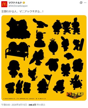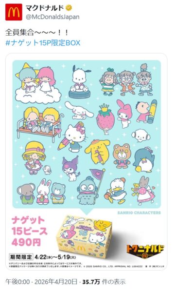 日本マクドナルドが、4月22日から4週間限定で「チキンマックナゲット 15ピース(ソース3個付き)」を250円引きの特別価格490円で販売。4月20日、同社の公式「X」アカウントが、限定ボックスに描かれる「サンリオキャラクターズ」のイラストを公開し、SNS上で注目を集めています。