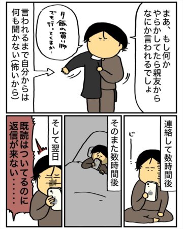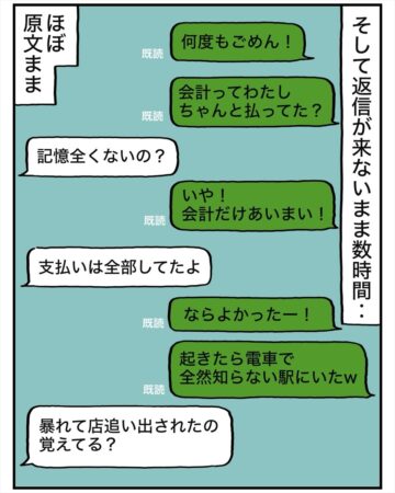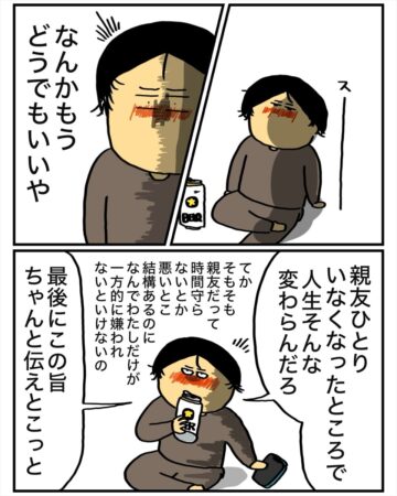 作者は、学生時代からの唯一の親友と、自身の酒癖の悪さが原因で、絶縁状態になってしまいました。そのきっかけとなったのは、親友と居酒屋に行った日。お店で飲んでいたはずなのに、ふと気付いたら1人で電車に乗っており…という内容で、読者からは「お酒のせいにして逃げない方がいい」「親友に謝って」などの声が上がっています。