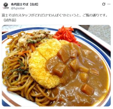 公式アカウントは、「富士そばのスタッフがどれだけ“わんぱく”かというと、ご覧の通りです」とコメント。焼きそばの上にトンカツをトッピングし、さらにカレーをかけた、ボリュームたっぷりの「試作品」の写真を投稿しました。
