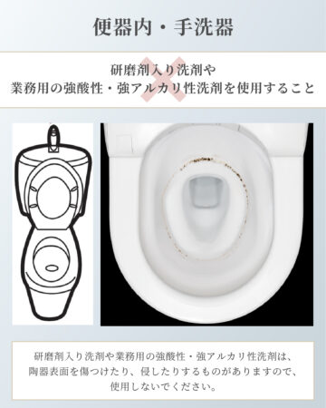 (1)便器内や手洗器の清掃時、研磨剤入り洗剤や業務用の強酸性、強アルカリ性洗剤を使用する